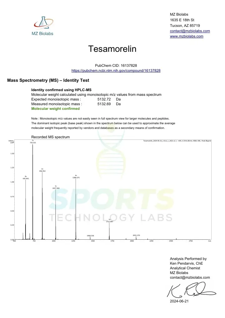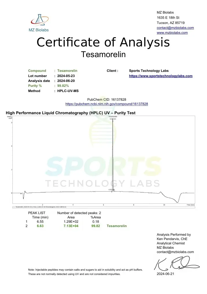 At Sports Technology Labs, our Tesamorelin peptide is manufactured under strict quality control measures to ensure the highest level of purity and reliability. Each batch is tested for purity exceeding 98% and is accompanied by a Certificate of Analysis (COA) from accredited US laboratories, ensuring product integrity for research purposes. It is essential to consult a health care professional when learning about this product, as Tesamorelin is not approved for human consumption and is considered a research chemical.